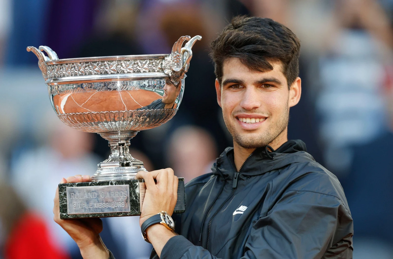 French Open 2024 winner Carlos Alcaraz with the trophy at Roland Garros