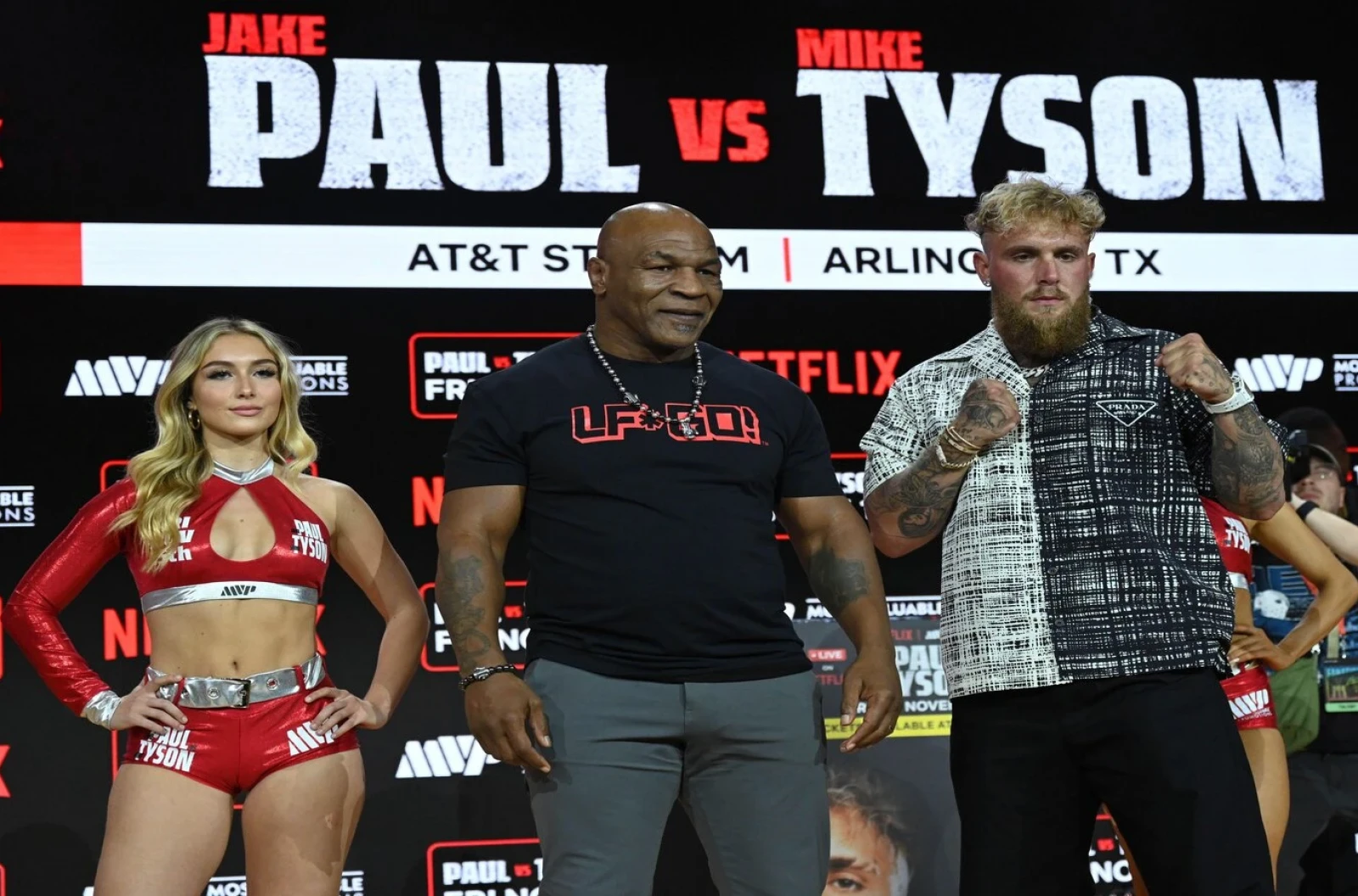 Mike Tyson and Jake Paul pose at a pre-fight press conference