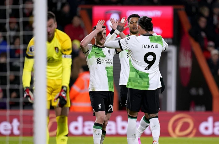 Premier League leaders Liverpool moved five points clear at the top of the standings with a 4-0 thumping away to Bournemouth with doubles from both Darwin Nunez and Diogo Jota.