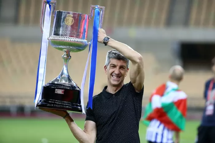 Real Socieded head coach Imanol Alguacil celebrates after they beat Athletic Bilbao to secure long-awaited trophy; celebrations gone wrong.